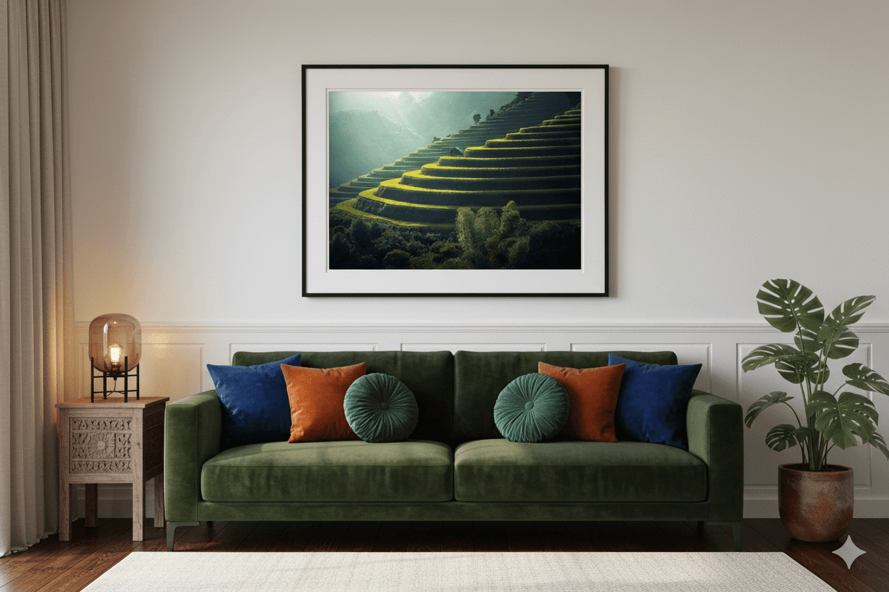 “The print feels serene and intentional. The frame craftsmanship is remarkable — understated but commanding presence. It transformed the entire room.”